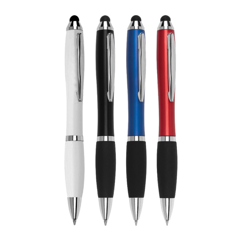 Plástico Mecanismo giratorio cuerpo curvo de color con detalles y clip metálicos. Punta touch para pantallas táctiles. Tinta negra.