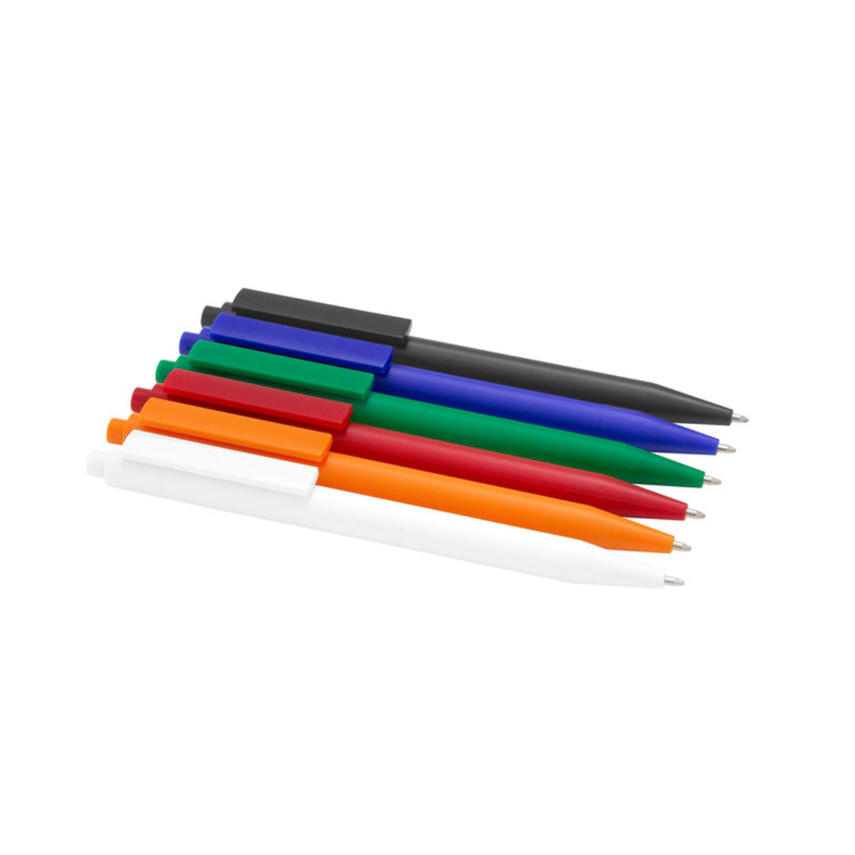 Plástico ABS. Bolígrafo retráctil. Cuerpo y clip plásticos del mismo color, cuerpo acabado mate y clip acabado brillante. Tinta negra. Amplia área de impresión.